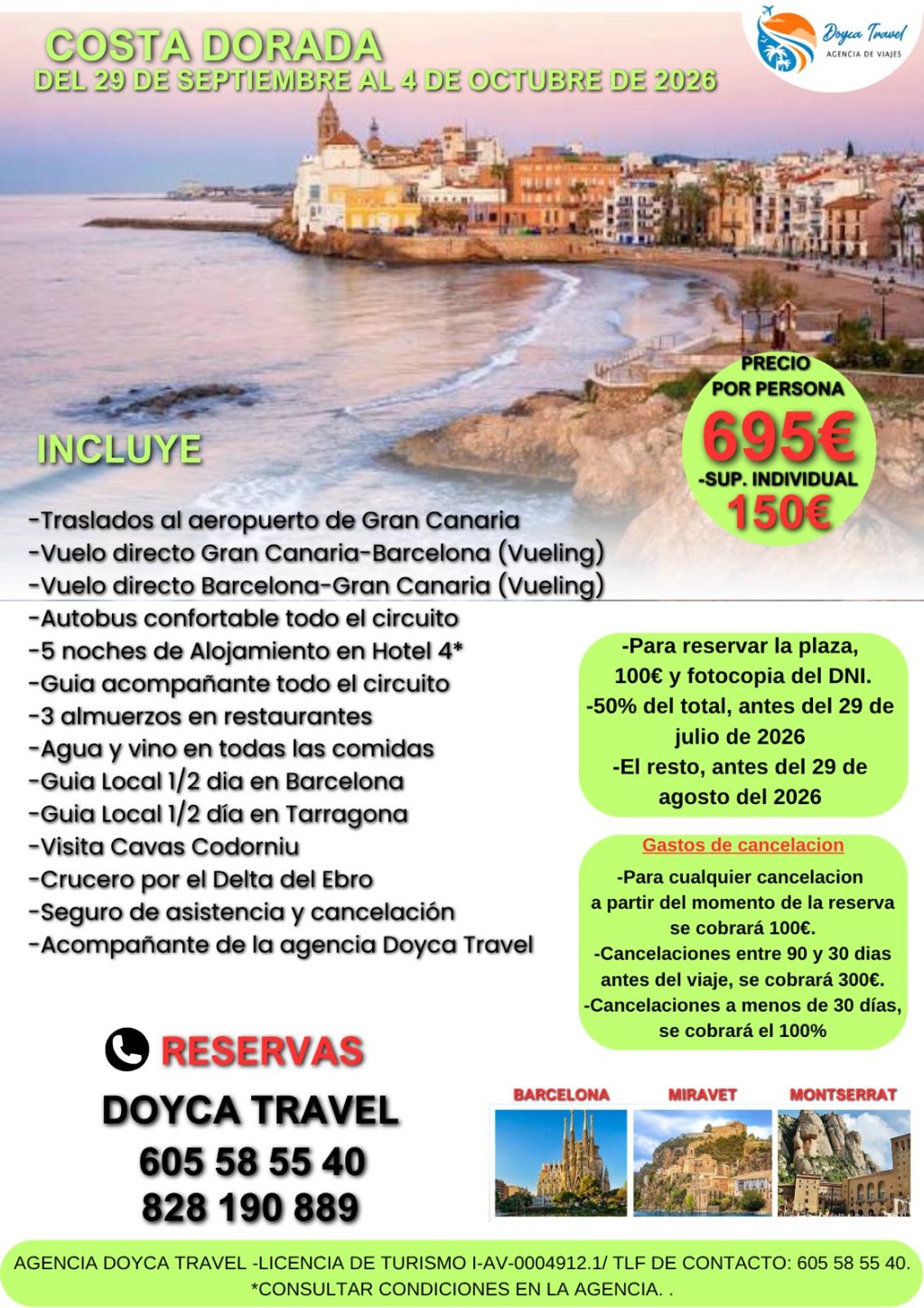 Recogida en los puntos acordados a la hora a cordada y traslado al aeropuerto de Gran Canaria, para agilizar los trámites de facturación en vuelo de línea con la compañía aérea Vueling con destino Barcelona y salida a las 6:30. Recogida de equipajes y salida hacia la ciudad Condal, capital de la comunidad catalana y segunda ciudad española. Su larga historia se hace patente en sus numerosos monumentos románicos, góticos y renacentistas. Comenzaremos el recorrido con visita panorámica de las avenidas más elegantes de la ciudad como el Paseo de Gracia, llagaremos a la Plaza de España subiremos a Montjuic para visitar el anillo olímpico. Ya en el centro encontramos la plaza de Cataluña, palacio de la Generalitat, barrio gótico, Catedral, Sagrada Familia, etc. ALMUERZO EN RESTAURANTE. Por la tarde recorreremos las famosa Ramblas donde se encuentra el Gran Teatro del Liceo y el mercado de La Boquería, hasta llegar al Port Vell. Traslado al hotel cena y alojamiento.